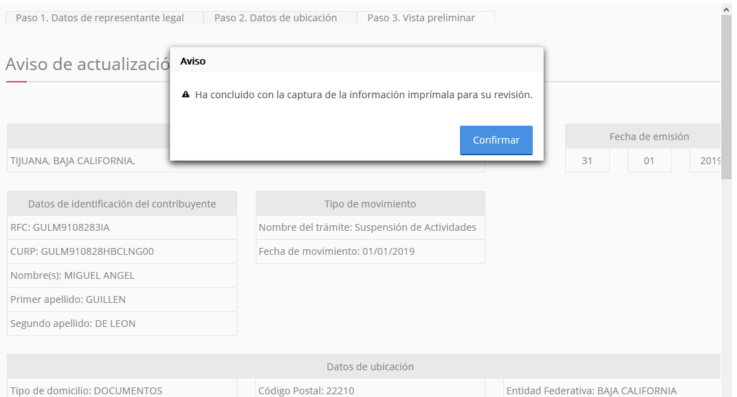 Nota: En caso de que se tenga que actualizar el domicilio, se tiene que realizar el aviso de Cambio de Domicilio antes del aviso de Suspensión de Actividades (se puede presentar el mismo día).